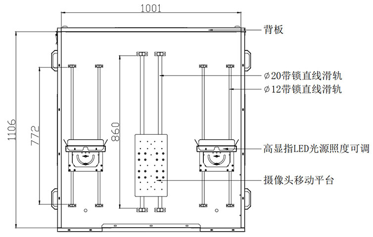 3.箱體內(nèi)部(如上圖)中間安裝有攝像頭移動(dòng)平臺(如下圖), 平臺下安裝兩根帶鎖直線滑軌,平臺可前后移動(dòng),也可移動(dòng)到某- -位置鎖緊滑軌固定。