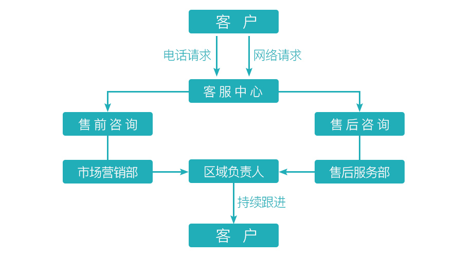 3、無(wú)論客戶是電話請(qǐng)求還是網(wǎng)絡(luò)請(qǐng)求,客服中心都會(huì)根據(jù)客戶需求進(jìn)行分類后直接轉(zhuǎn)接相應(yīng)部門,部門負(fù)責(zé)人會(huì)根據(jù)客戶需求轉(zhuǎn)接區(qū)域負(fù)責(zé)人,區(qū)域負(fù)責(zé)人將與客戶之間對(duì)接高效快捷。