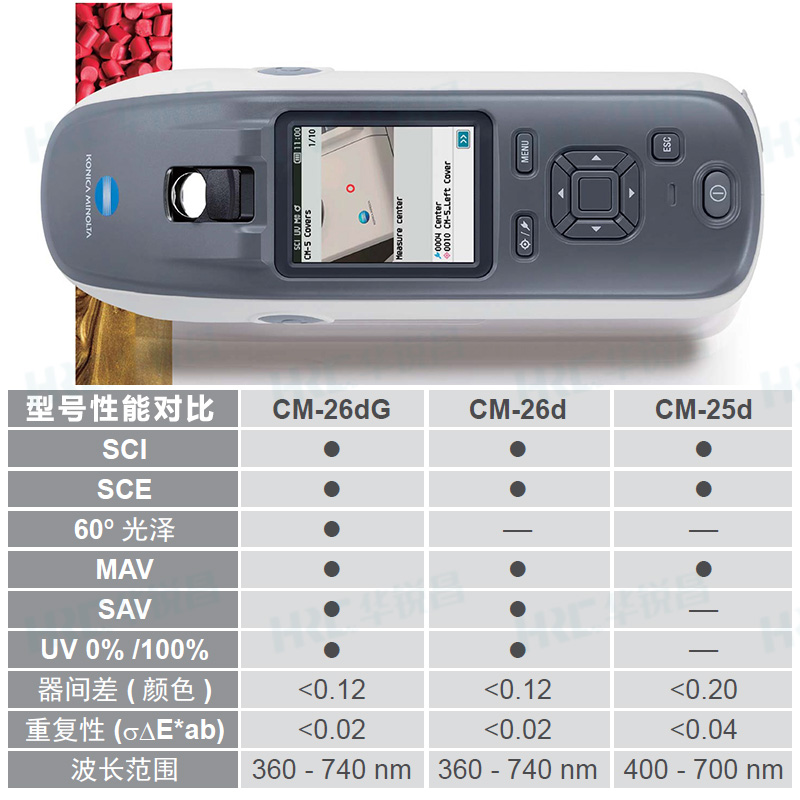 柯尼卡美能達的新一代CM-26dG系列,包含三款便攜式分光測色計型號,高端旗艦型號CM-26dG和CM-26d擁有精湛的技術和業界快速的測量精度,其中,CM-26dG是二合一機型,可同時進行色彩與光澤測量,CM-26d專注于色彩測量,CM-25d則是該系列的經濟高效型號,高性價比之選。