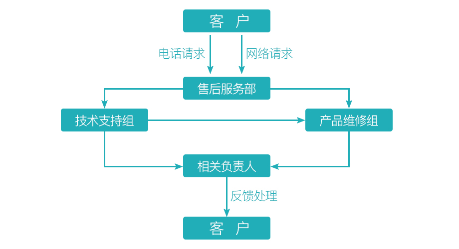 2、無論客戶是電話請求還是網絡請求,客服中心都會根據客戶反饋的問題進行分類后直接轉接相應部門,部門負責人會根據客戶請求進行處理并給出相應解答,處理結果將會交接給區域負責人,區域負責人將問題反饋給客戶并配合處理一切售后事務。